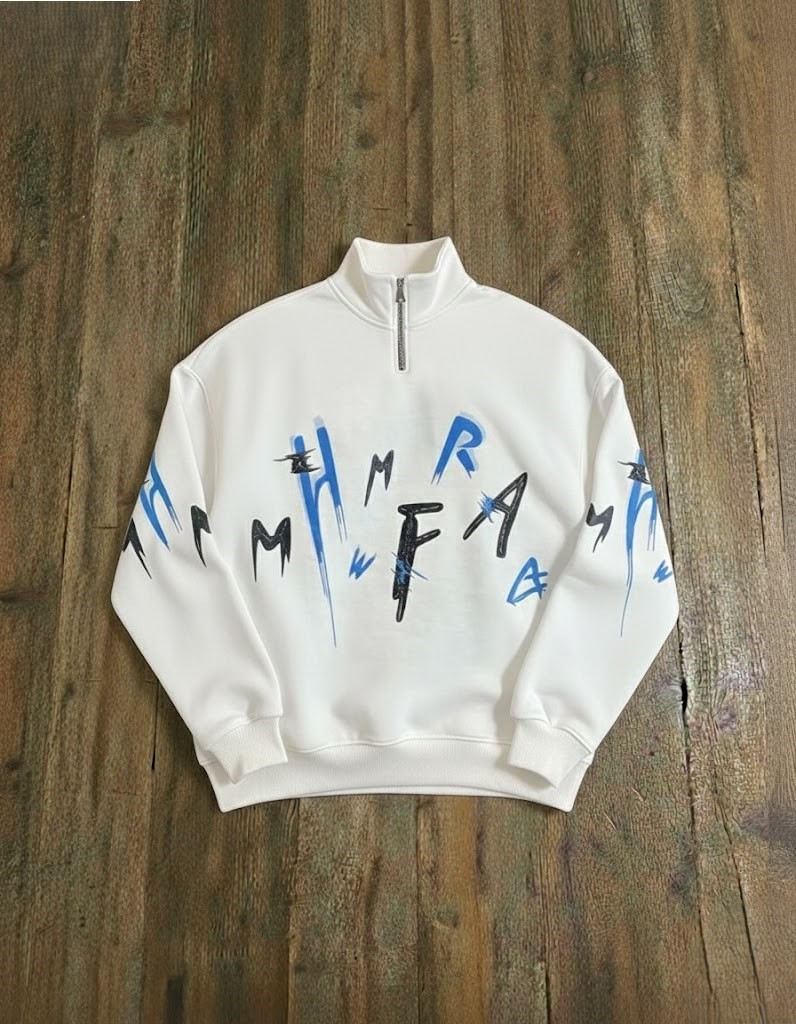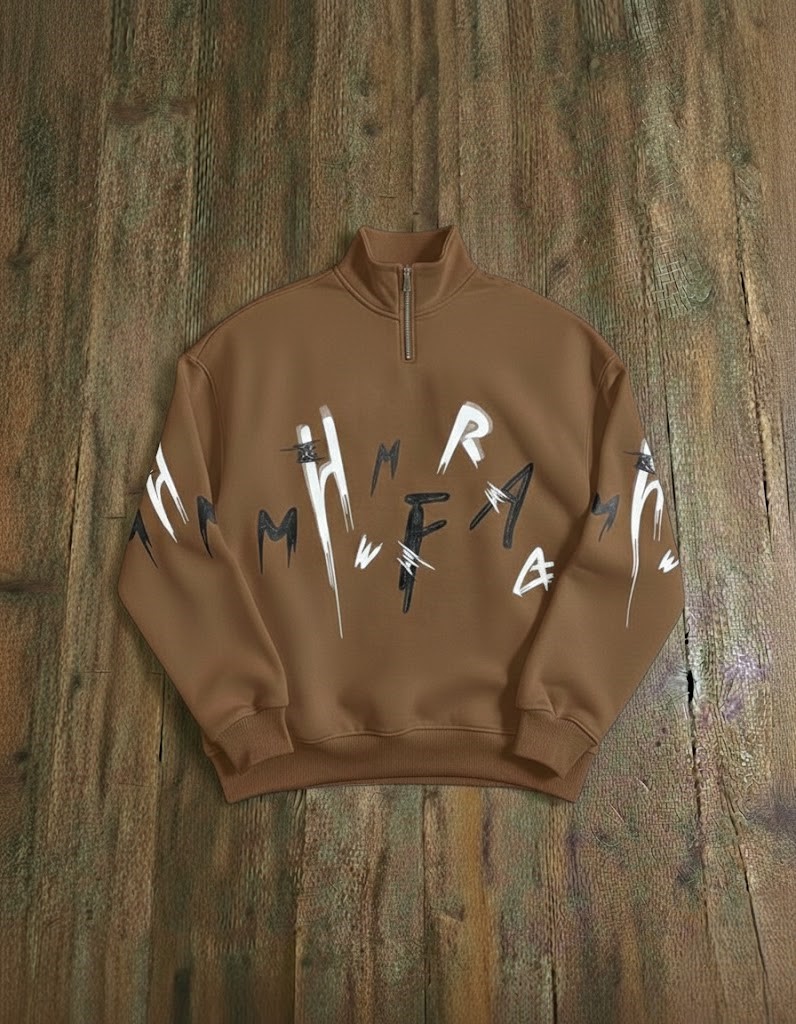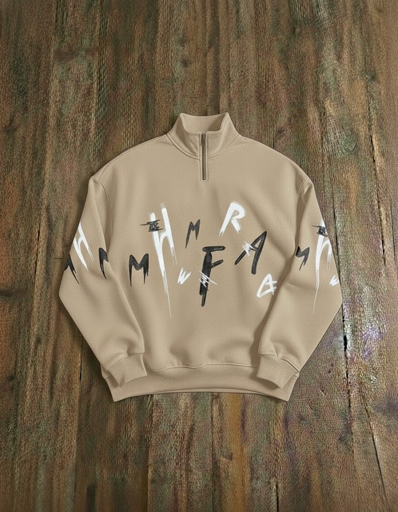 This relaxed-fit pullover makes a bold statement with its high-contrast, distressed graphic treatment. The top features an all-over abstract design composed of stylized, brushstroke-like letters and fragmented shapes. Its structure includes a tall mock neck and a practical quarter-zip placket for versatile wear. The comfortable knit construction, finished with ribbed cuffs and hem, pairs high-impact visual design with essential comfort, fitting perfectly into modern streetwear trends.