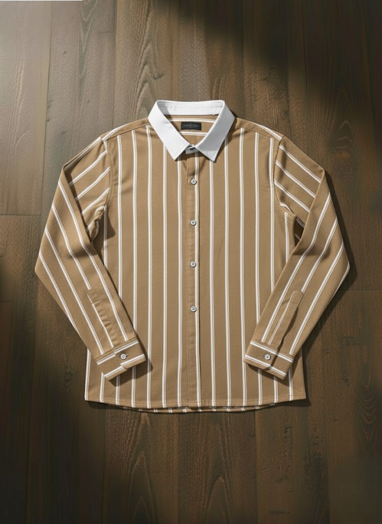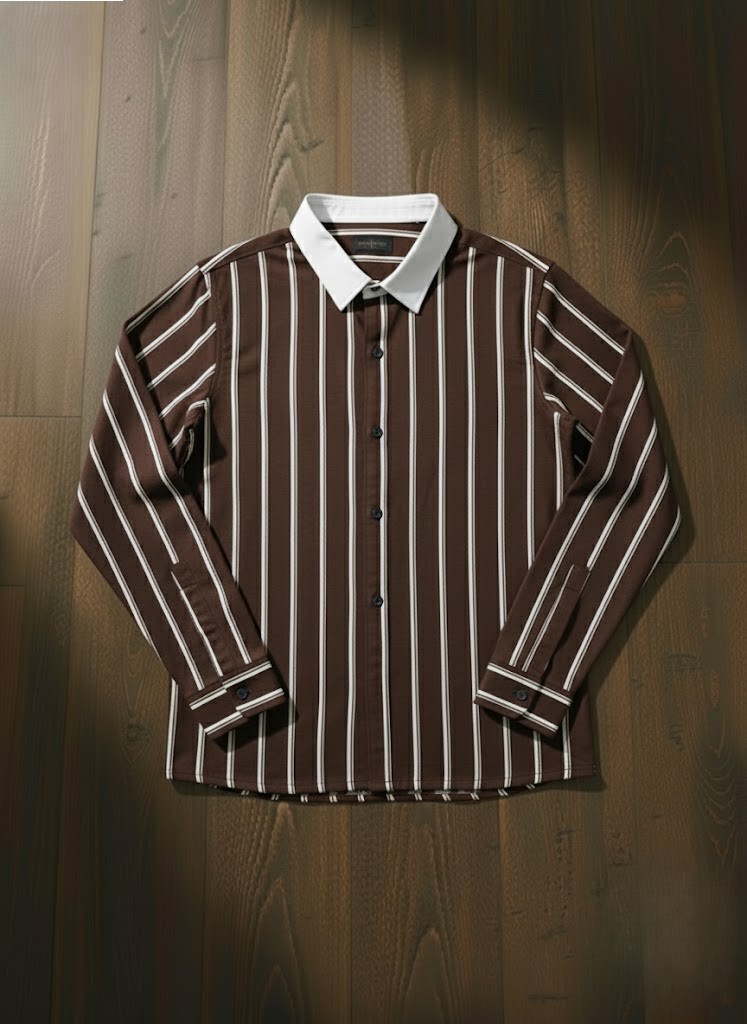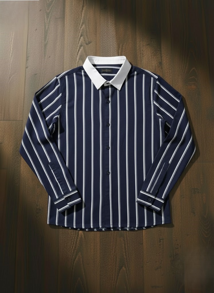 An instant classic with a distinctive touch. This long-sleeve button-down shirt features a striking vertical stripe pattern across the body and sleeves for a lengthening, powerful silhouette. The structure is finished with a sharp, contrasting spread collar and button cuffs. Tailored for a clean fit, this shirt transitions effortlessly from professional settings to elevated casual outing
