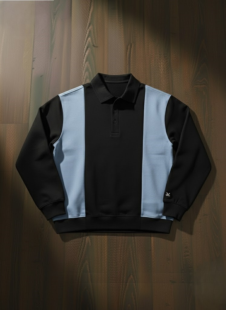 A clean, sharp piece defined by its strong vertical composition. This knit top uses two distinct materials or tones, with large panels framing the center placket for maximum contrast. The long sleeves, structured collar, and pullover fit make it an essential, versatile staple for smart-casual dressing.