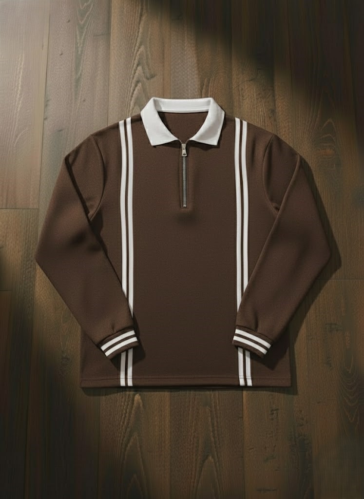 This long-sleeve knit top offers a clean, athletic aesthetic with a structured, contrasting collar. It is defined by the twin vertical stripes running parallel to the center, creating a dynamic, high-contrast look. The top features a modern quarter-zip placket for versatile styling and a comfortable, pull-over fit, making it an excellent choice for a polished yet active appearance.